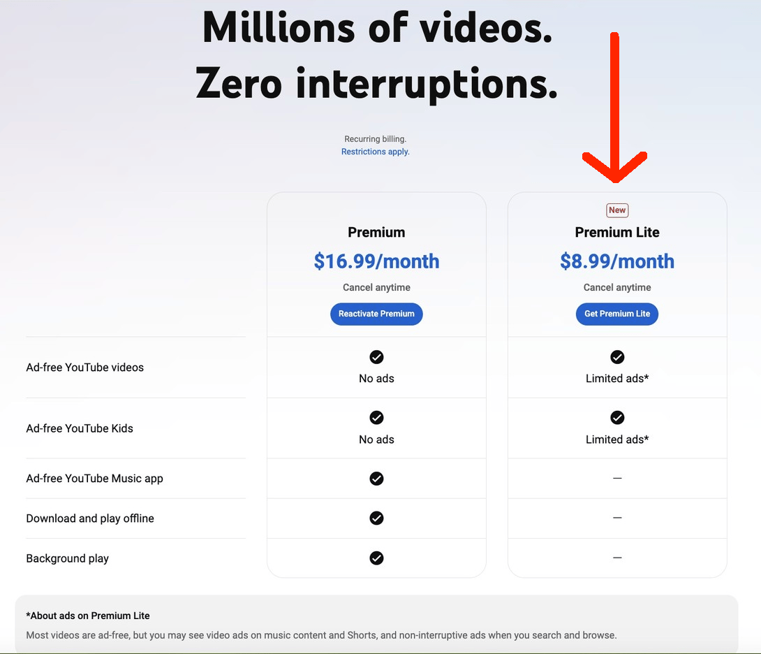 Whereas ‘Premium’ includes content-related features such as YouTube Music, background play, and play offline, Premium Lite does not. It ONLY removes ads.
